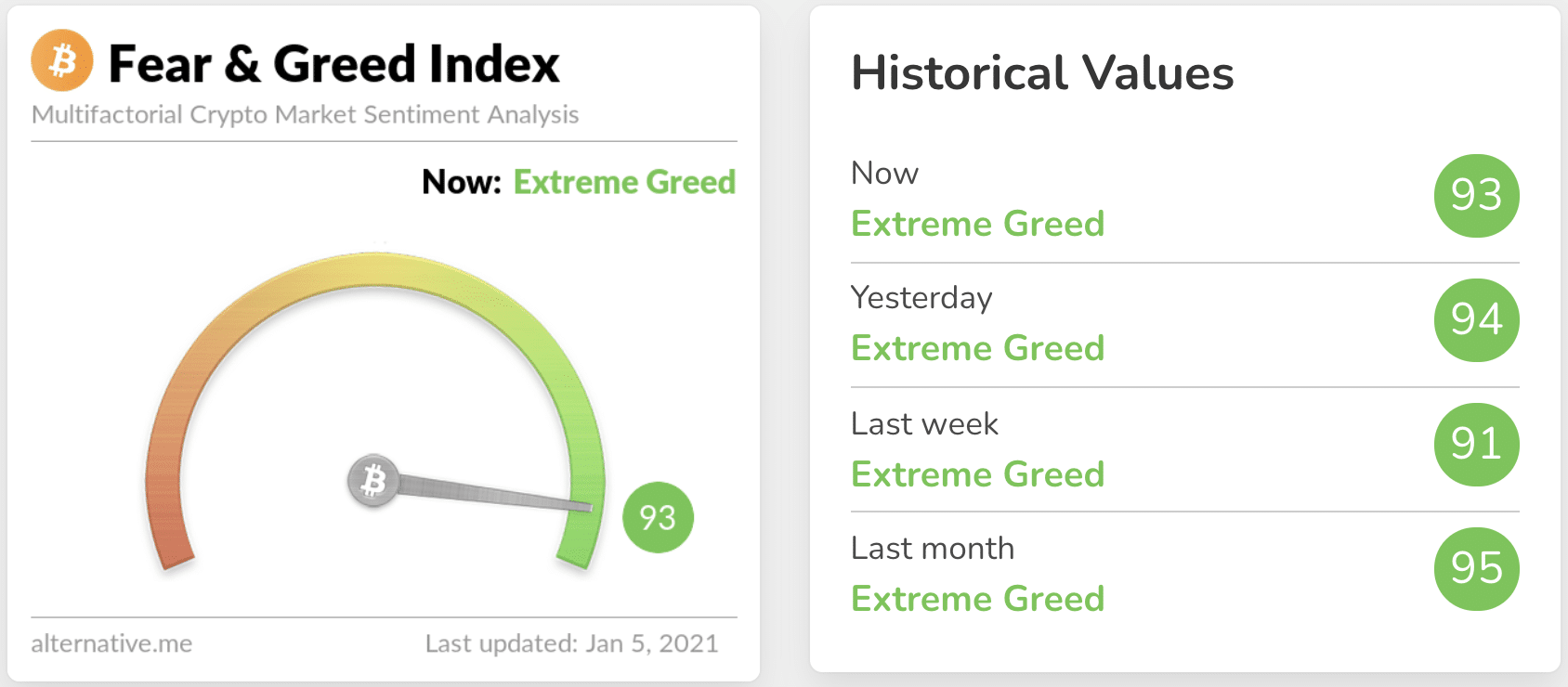 Despite yesterday’s dip, the sentiment remains in Extreme Greed territory at 93, albeit down from 94 yesterday. The last time the sentiment was not in Extreme Greed was 5 November, 2020.