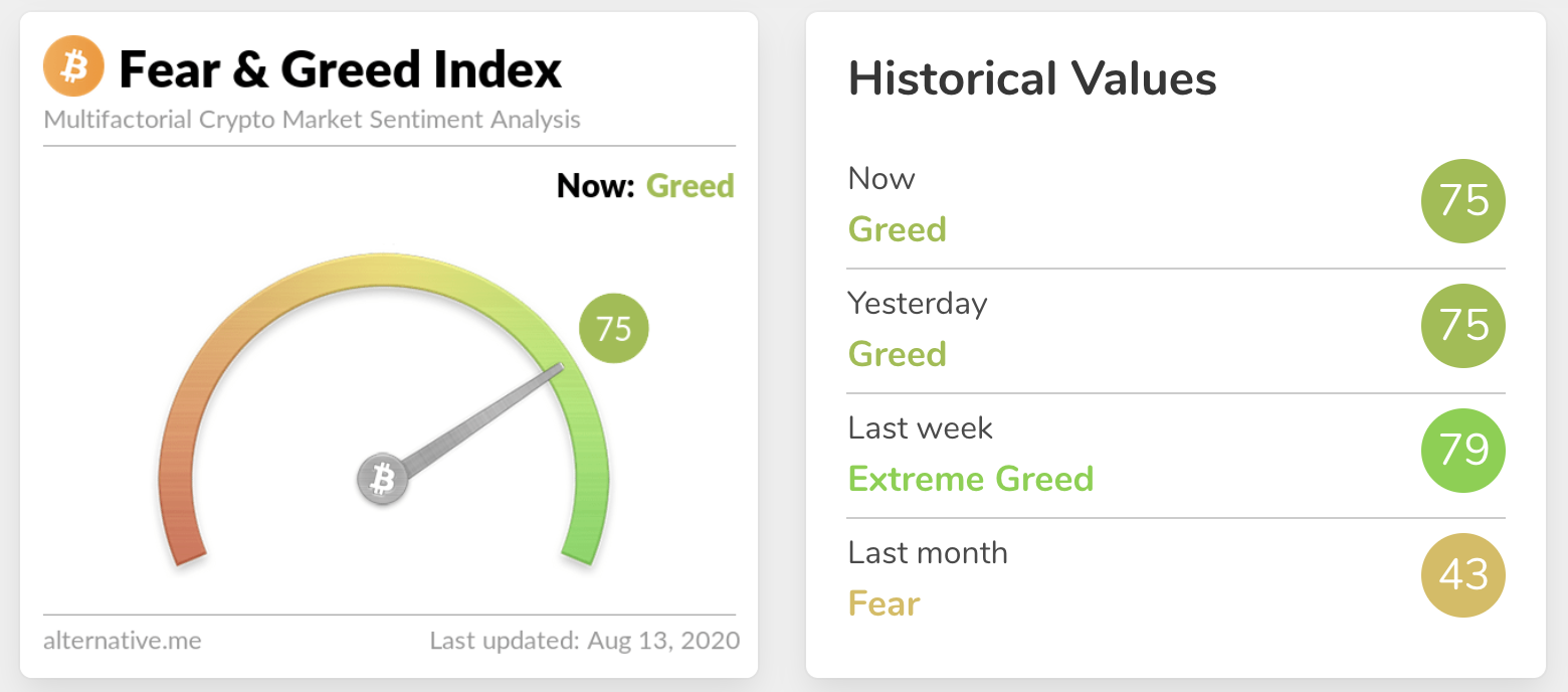 We closed yesterday, 12 August 2020, at a price of $11,584.93 – with a daily high of $11,748.40 and a low of $11,249.61.