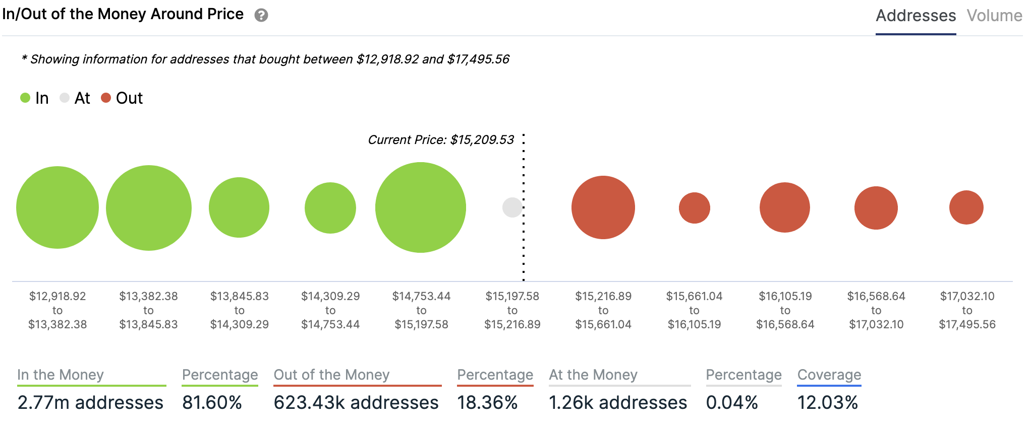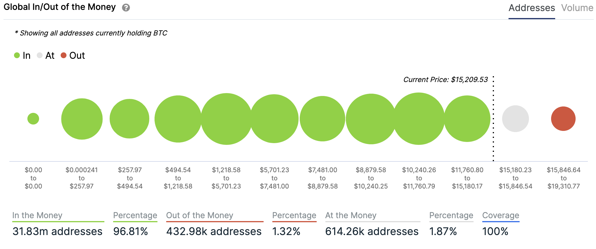 For any address with a balance of tokens, ITB identifies the average price (cost) at which those tokens were purchased and compares it with the current price. If the current price is higher than average cost, address is ‘In the Money’. If the current price is lower than the average cost, the address is ‘Out of the Money’.