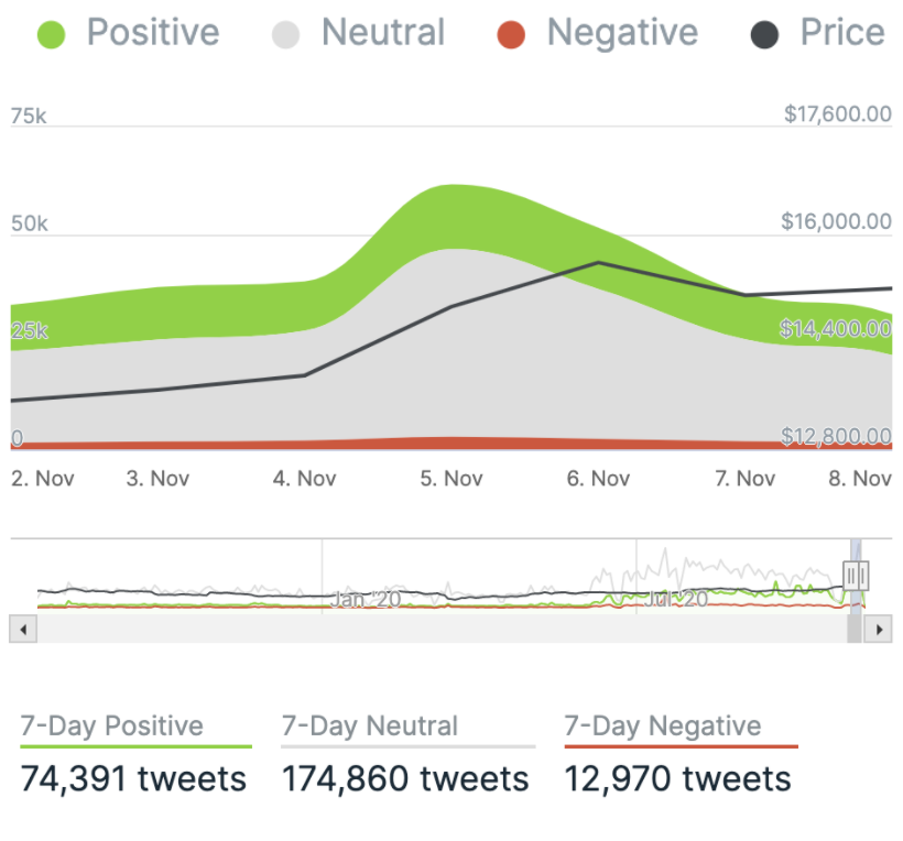 Yesterday, there were 9,491 tweets sent with a positive connotation towards bitcoin, 20,397 with a neutral connotation, and 1,558 were negative.