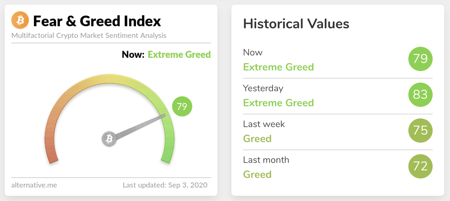 We’re still up there in Extreme Greed, down 4 points from 83 yesterday to 79. August was characterised by greed, and we’ve never seen a whole month up in this area – will the run continue through September?