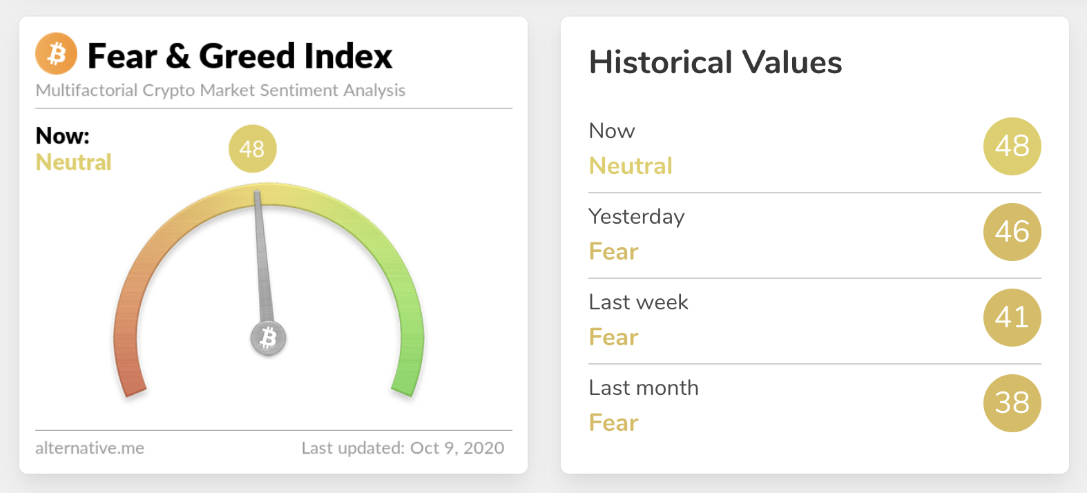Sentiment is at 48 – up from 46 yesterday. That’s the highest level we’ve seen so far in October. Extreme fear can be a sign that investors are too worried, which could be a buying opportunity. When Investors are getting too greedy, that means the market may be due for a correction. Are we set for a big move?