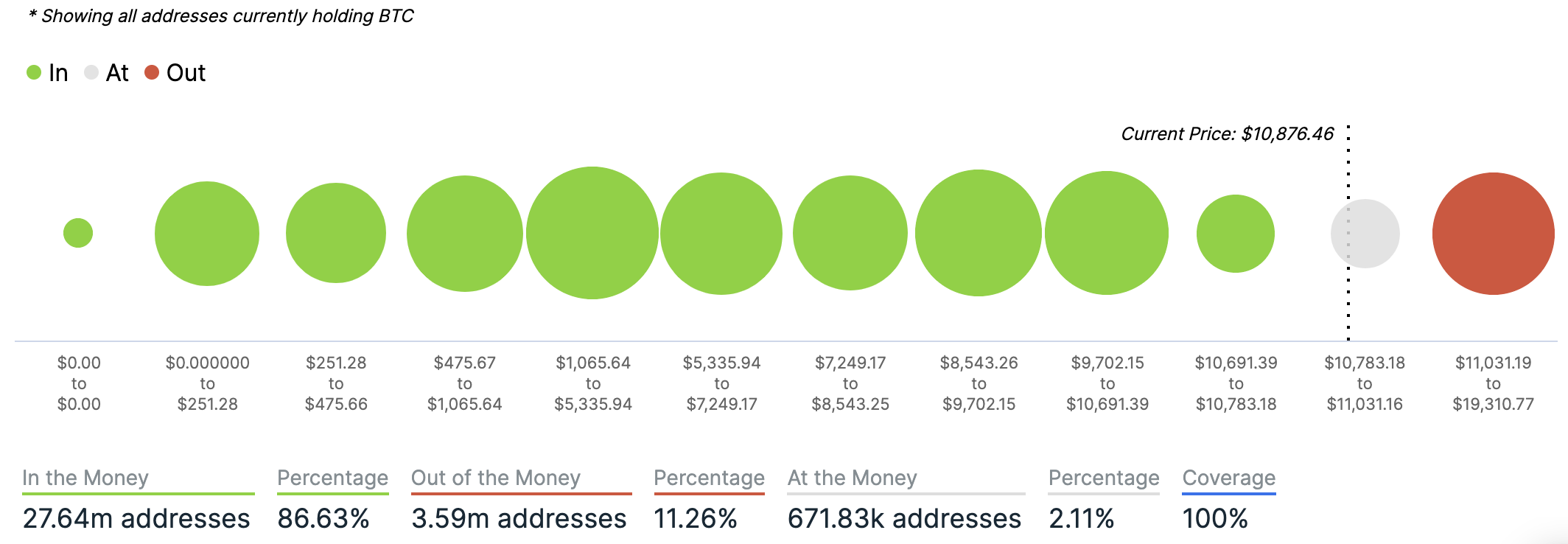 For any address with a balance of tokens, ITB identifies the average price (cost) at which those tokens were purchased and compares it with the current price. If the current price is higher than average cost, address is ‘In the Money’. If the current price is lower than the average cost, the address is ‘Out of the Money’.
