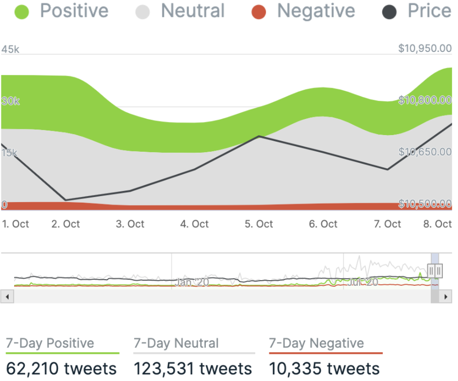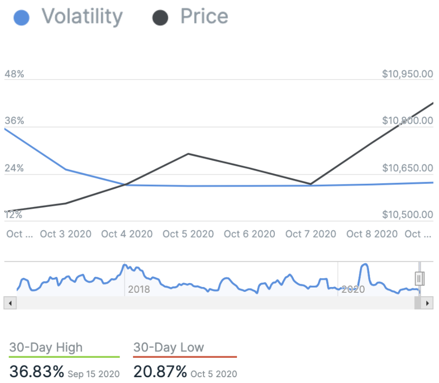 We closed yesterday, 8 October, 2020, at a price of $10,923.63, with a daily high of $10,939.80 and a low of $10,569.82. That’s the highest daily closing price since 20 September.