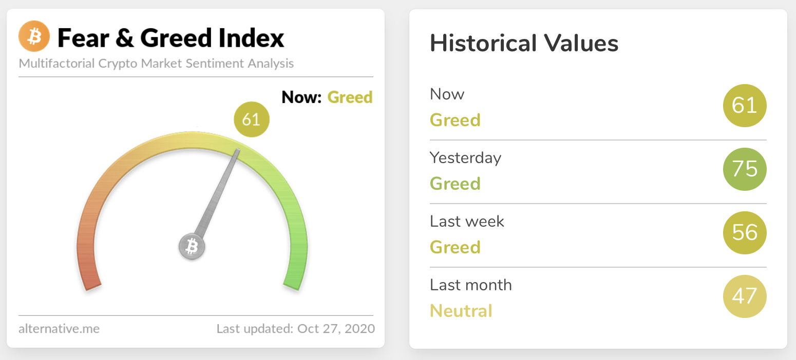 We’re still in the green, though there was a sharp drop from 75 yesterday to 61 today. This isn’t necessarily a bad thing – while extreme fear can indicate that investors are too worried, when investors are getting too greedy that means the market may be due for a correction.
