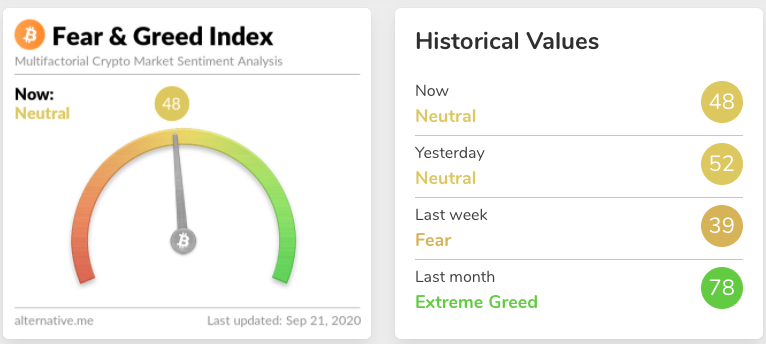With more upwards price action, sentiment is down from 52 to a neutral 48 – moving out of the fear zone seen last week.