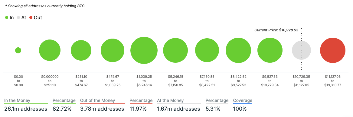 For any address with a balance of tokens, ITB identifies the average price (cost) at which those tokens were purchased and compares it with the current price. If the current price is higher than average cost, address is ‘In the Money’. If the current price is lower than the average cost, the address is ‘Out of the Money’.
