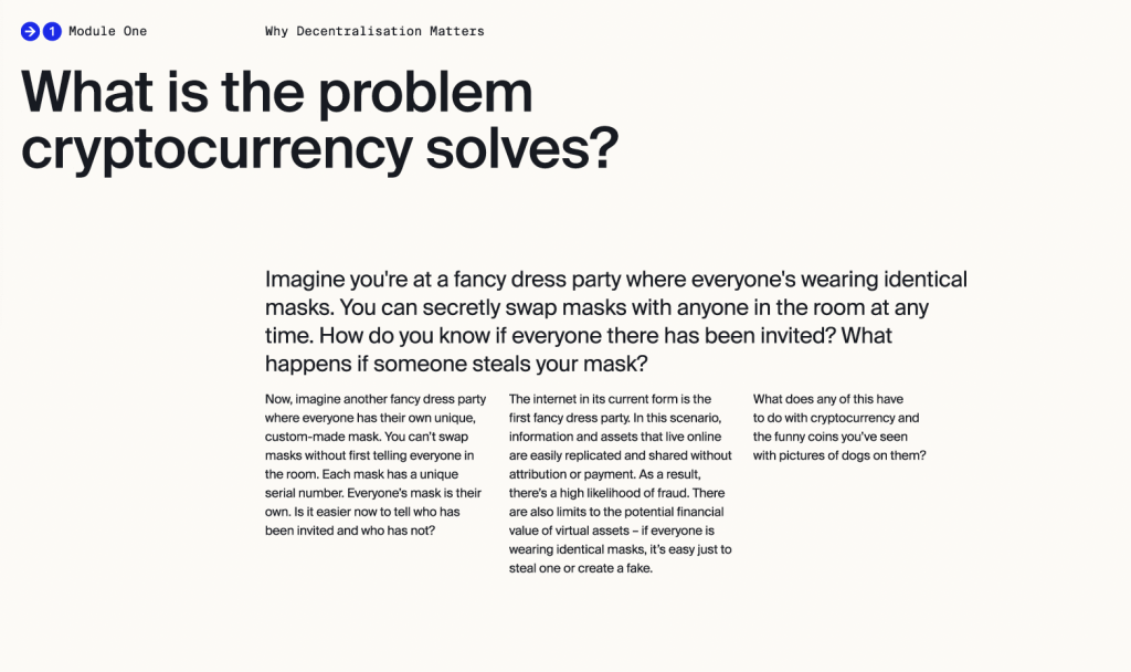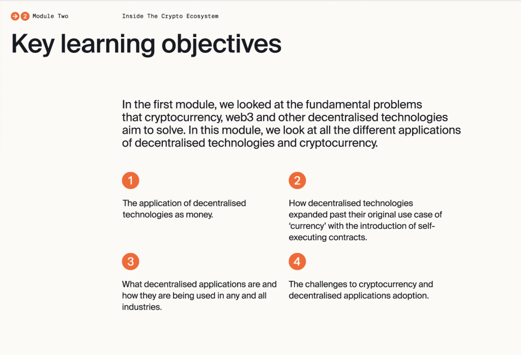 A cornerstone of cryptocurrency is the democratisation of ownership, and this course is designed to lay the foundation and guide you toward accessing it, safely and responsibly.