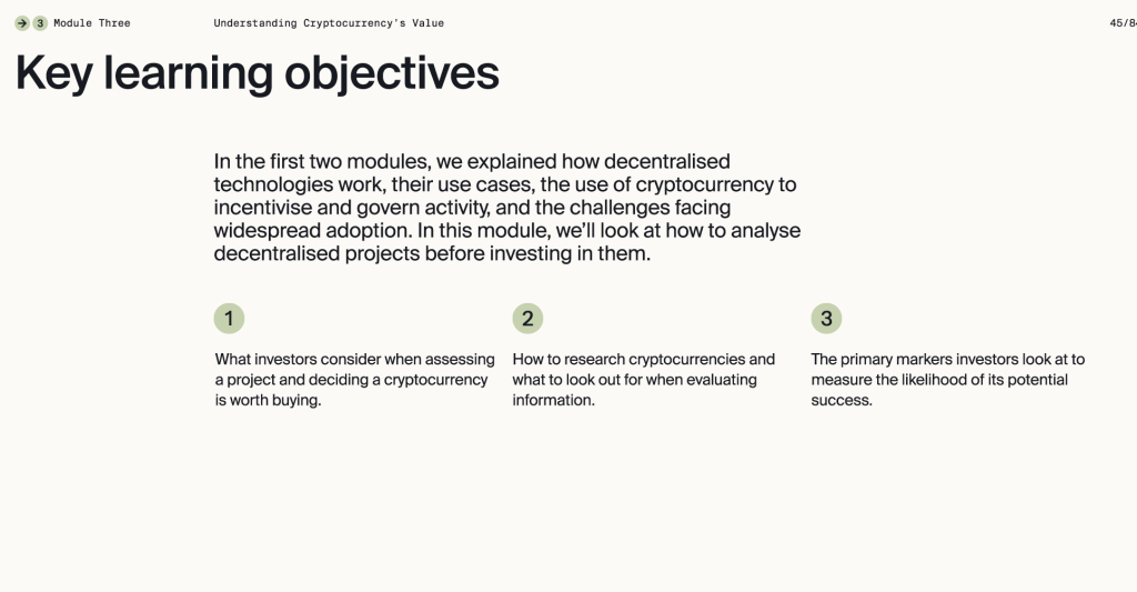 By the end of these modules, which cover some 80+ pages, newcomers should find crypto less overwhelming, while those already familiar with crypto investing will gain deeper insights into the technical and philosophical nuances behind the technology.