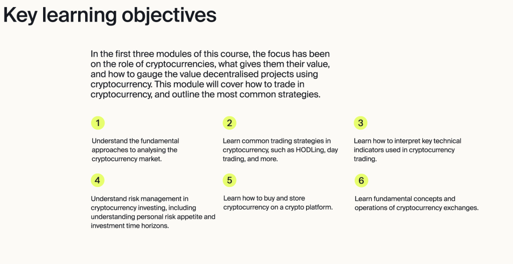This comprehensive course is your guide through the crypto landscape, outlining why crypto exists and the problems it solves. You’ll build your understanding of the crypto ecosystem and the role of cryptocurrencies, as well as how to invest in its future potential and trade crypto assets. We’re here to provide a clear path, helping you understand where to focus and what to consider.