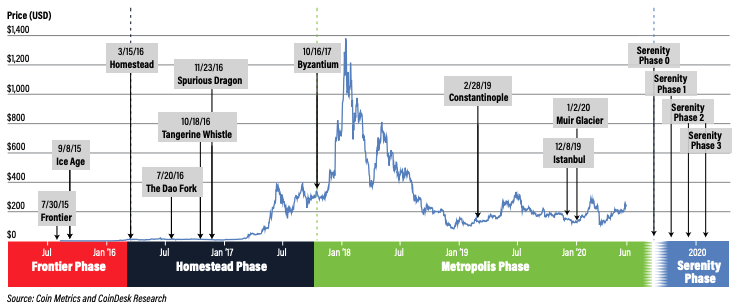 (Above: ETH price, protocol upgrades and Ethereum phases of development vs. time. Source: CoinDesk)