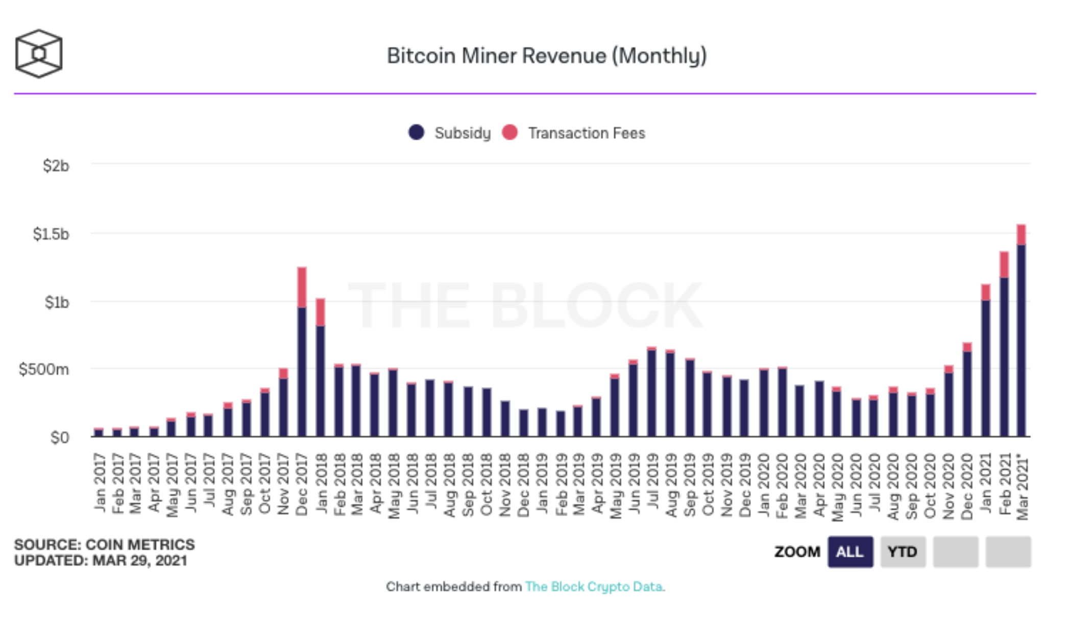 According to data collected by The Block Research, bitcoin miners have earned more than $1.5 billion in revenue so far in March.