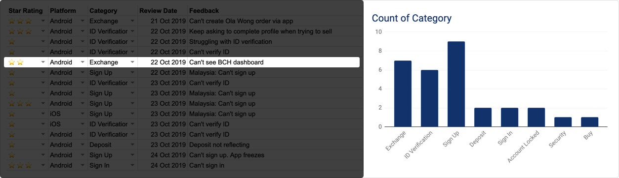 We also created a Google sheet where we document and tag the reviews to help us better quantify the data.