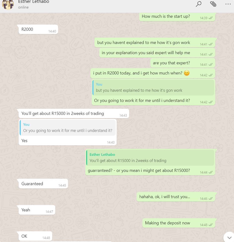 This customer in the following example explained his whole experience in full detail by sending us screenshots of a WhatsApp conversation he had with a scammer. These types of tickets enable us to learn a lot without having to write a script or without having to get customers into the office.