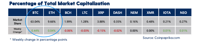 Ether (ETH) is still looking strong, too. It’s increasingly gaining market share, while other large caps struggle to follow the two leaders.