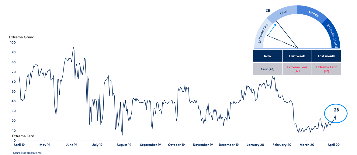 The Fear and Greed Index has finally escaped the “Extreme Fear” area, where it has lingered since 9 March – the longest period registered since the index launched in February 2018. We are now back in the “Fear” area, as investors are getting more confident.