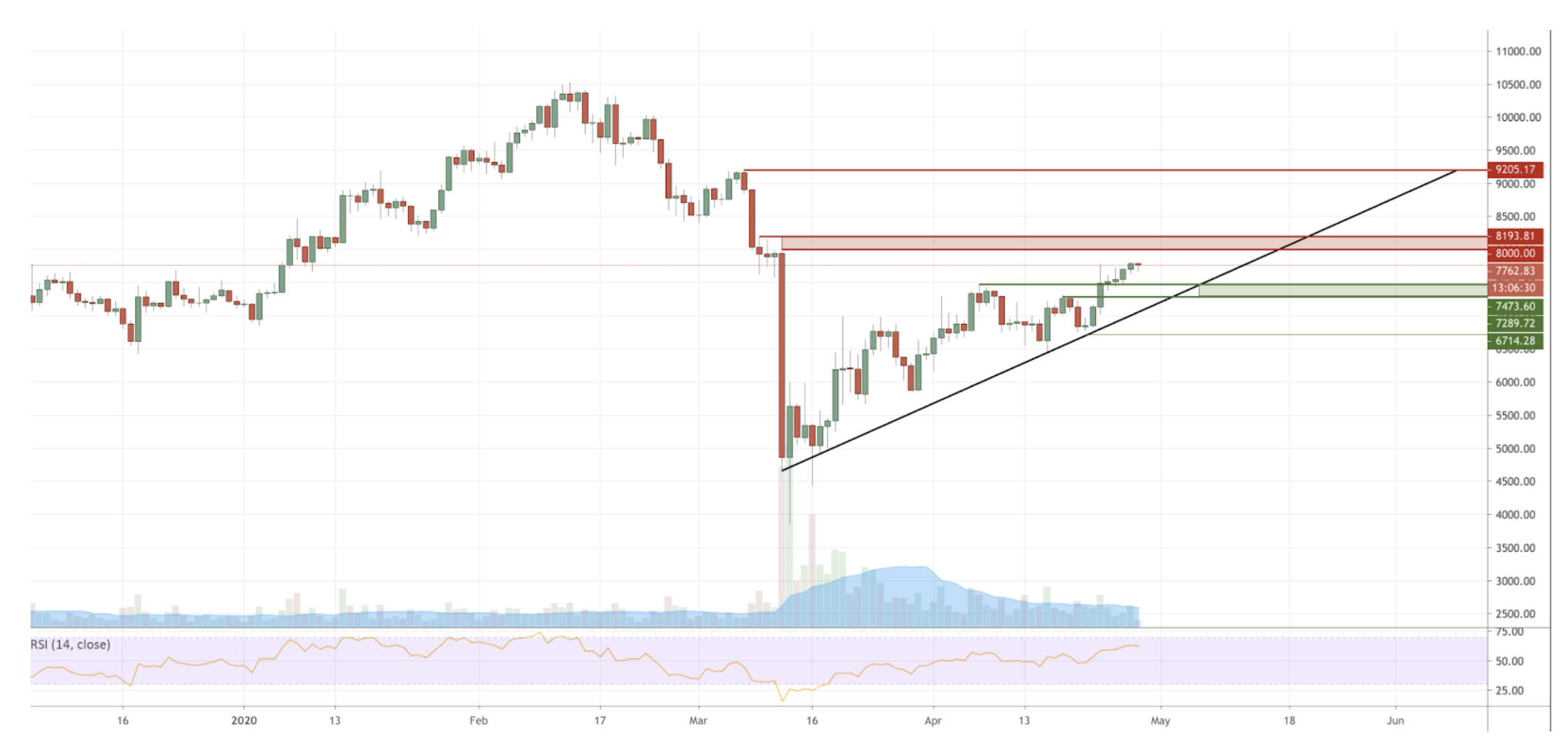 After a retrace down to $6,700, Bitcoin rebounded strongly to the $7,800 mark, comfortably breaking through the April high resistance of $7,500. This most recent move to the upside further consolidates the upward momentum that has been building since mid-March.