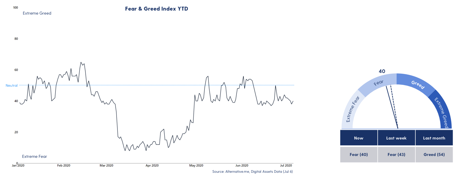 If we look back at the first half of 2020 from a market sentiment perspective, the trend is clear. Except for a longer period in February and a few spikes in May, the market sentiment has stayed below neutral and in the fearful area this year. Less than 25% of the first half has been in a greedy state, which gives a good summary of the year so far: Uncertainty and fear have been highly present.