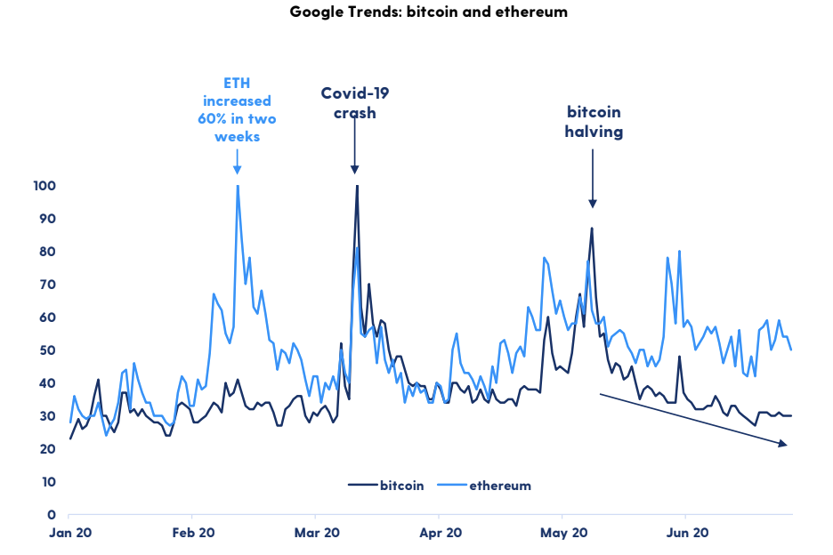 It is interesting to note that the search interest for Ethereum has remained fairly high after the market recovered and throughout the second quarter of 2020. This might be linked to increased interest around DeFi. On the other hand, bitcoin’s search interest has dropped again after the halving in May and ended the first half of 2020 down to early March levels.