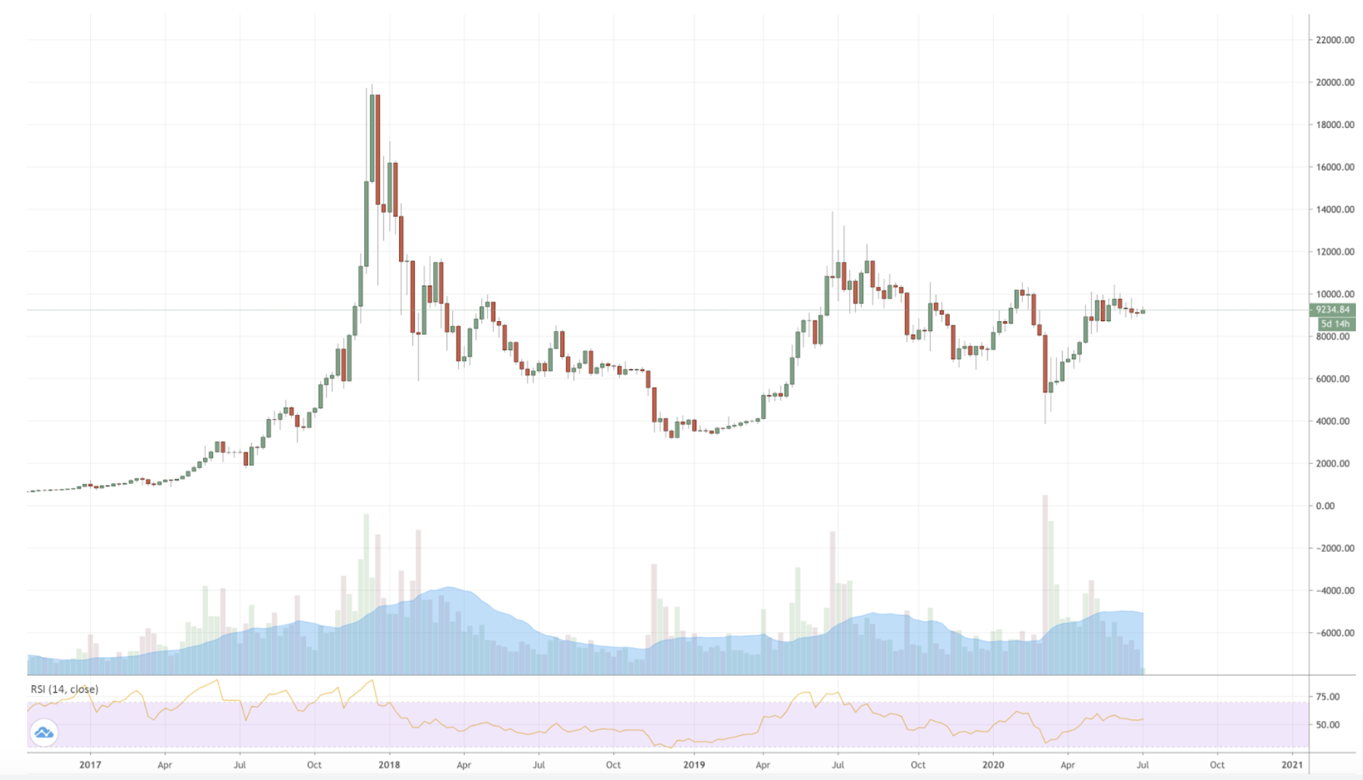 The recovery has, however, stagnated in recent weeks, with the price ranging largely between $9,000 and $9,800 since early May. Which is where we are today.