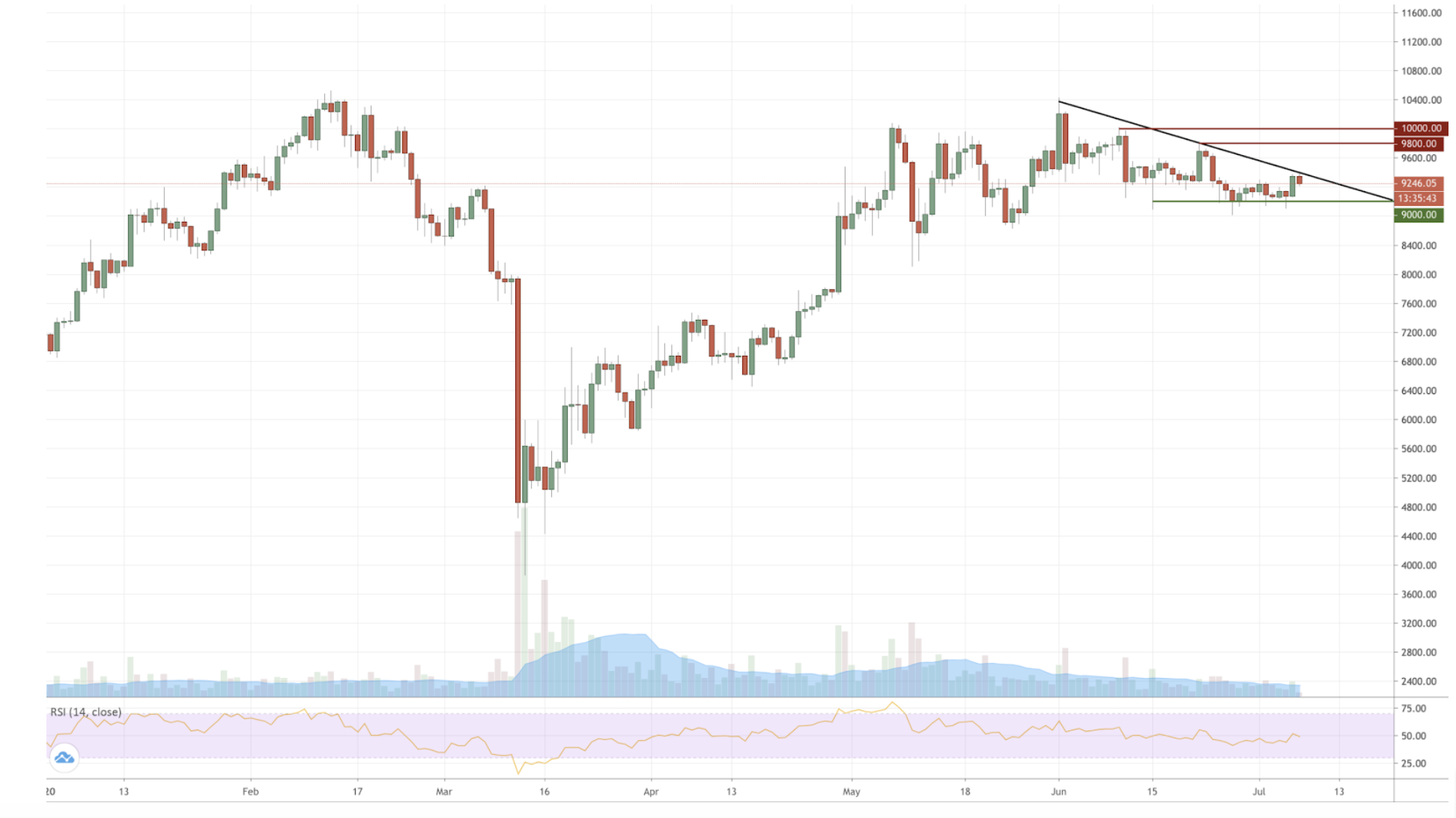 After more than a week of range-bound sideways price action, Monday finally saw BTC break out of its short term $9,000 to $9,300 channel to close at $9,400 – its biggest price jump since 25 June. However, while it may have made for exciting visual stimulus on the day, trading volumes have unfortunately not followed suit. As a result, there was a small subsequent retrace to the previously mentioned $9,300 resistance zone. This has helped to solidify the formation of a descending triangle pattern that began taking shape from the 1 June this year.