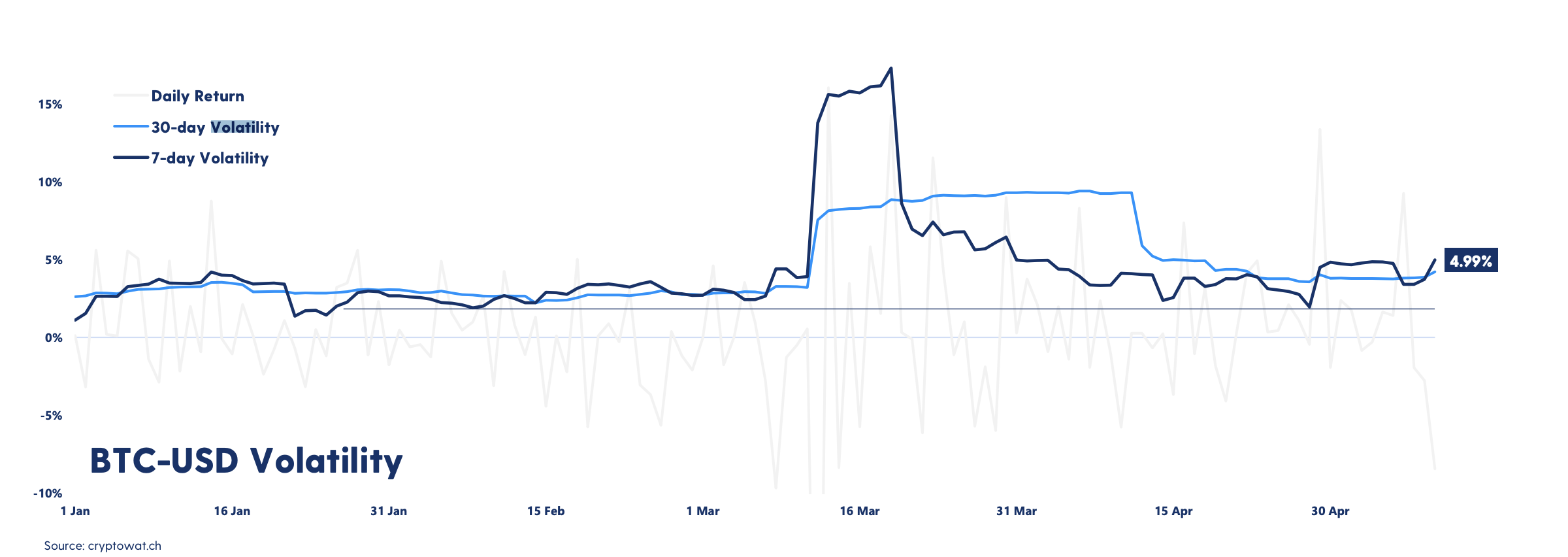 Volatility is seemingly here to stay with the 7-day volatility last week reaching levels not seen since March. Bitcoin ended its streak of 7 green weekly candles, closing the week $100 below where it started – in spite of a strong rally up towards the $10,000 mark – with price trading in a range nearly as wide as $2,000 over the course of the week. Following the halving, it will be interesting to see how the volatility evolves this week.