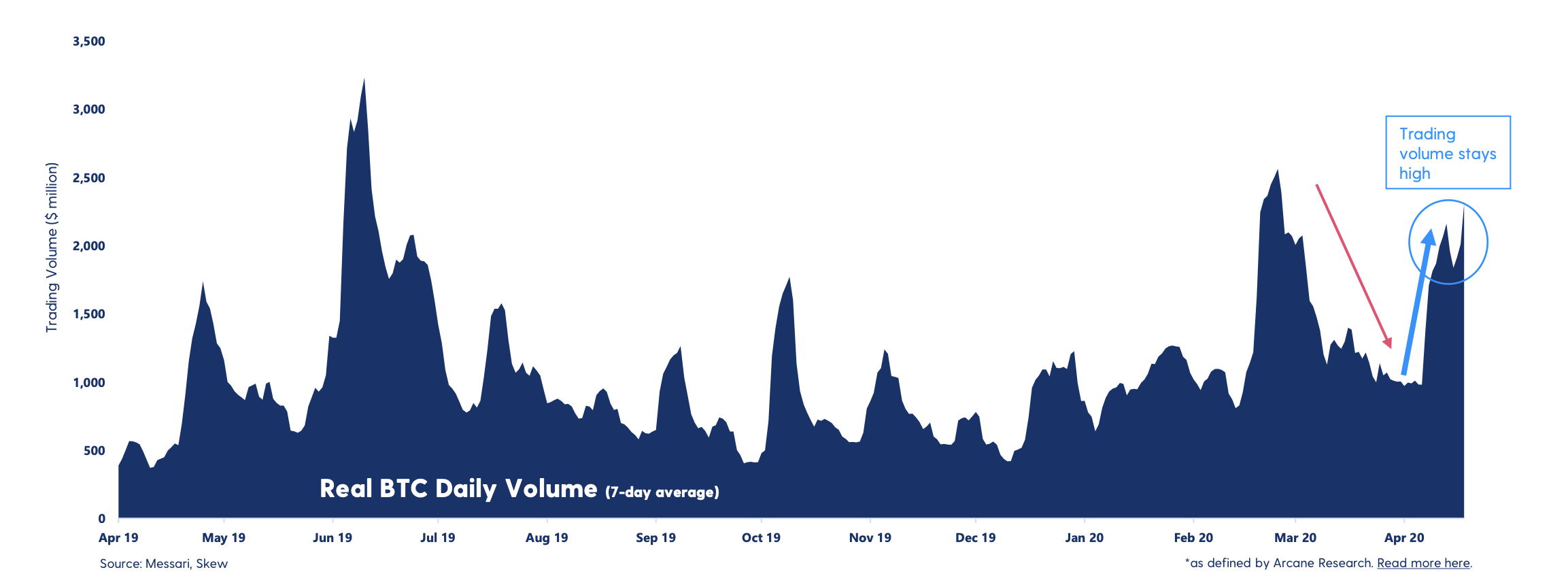 The 7-day average real trading volume* spiked above $2 billion last week, as the volume holds strong. It will be interesting to see if the volume could continue to hold at these levels, or if we will see the same kind of drop downwards as we did in March. Yesterday’s daily volume crossed $3 billion for the sixth time in 2020.
