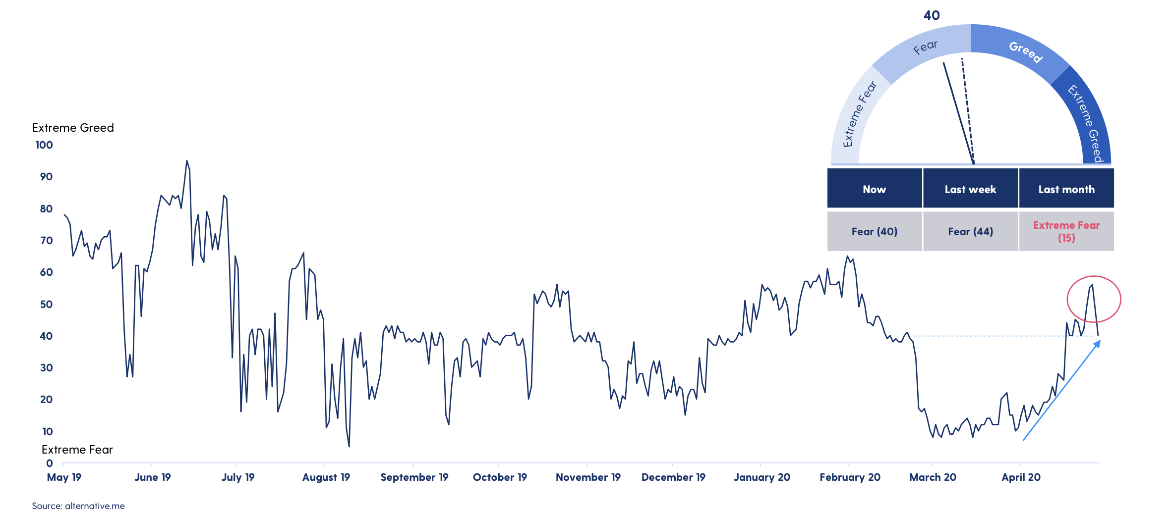 The Fear & Greed Index continued to climb last week, as the momentum looked strong. After pushing above 50 and entering a “greedy” state, the index fell back after the pullback this weekend. We’re currently back in “Fear”, and the index is at 40 again.