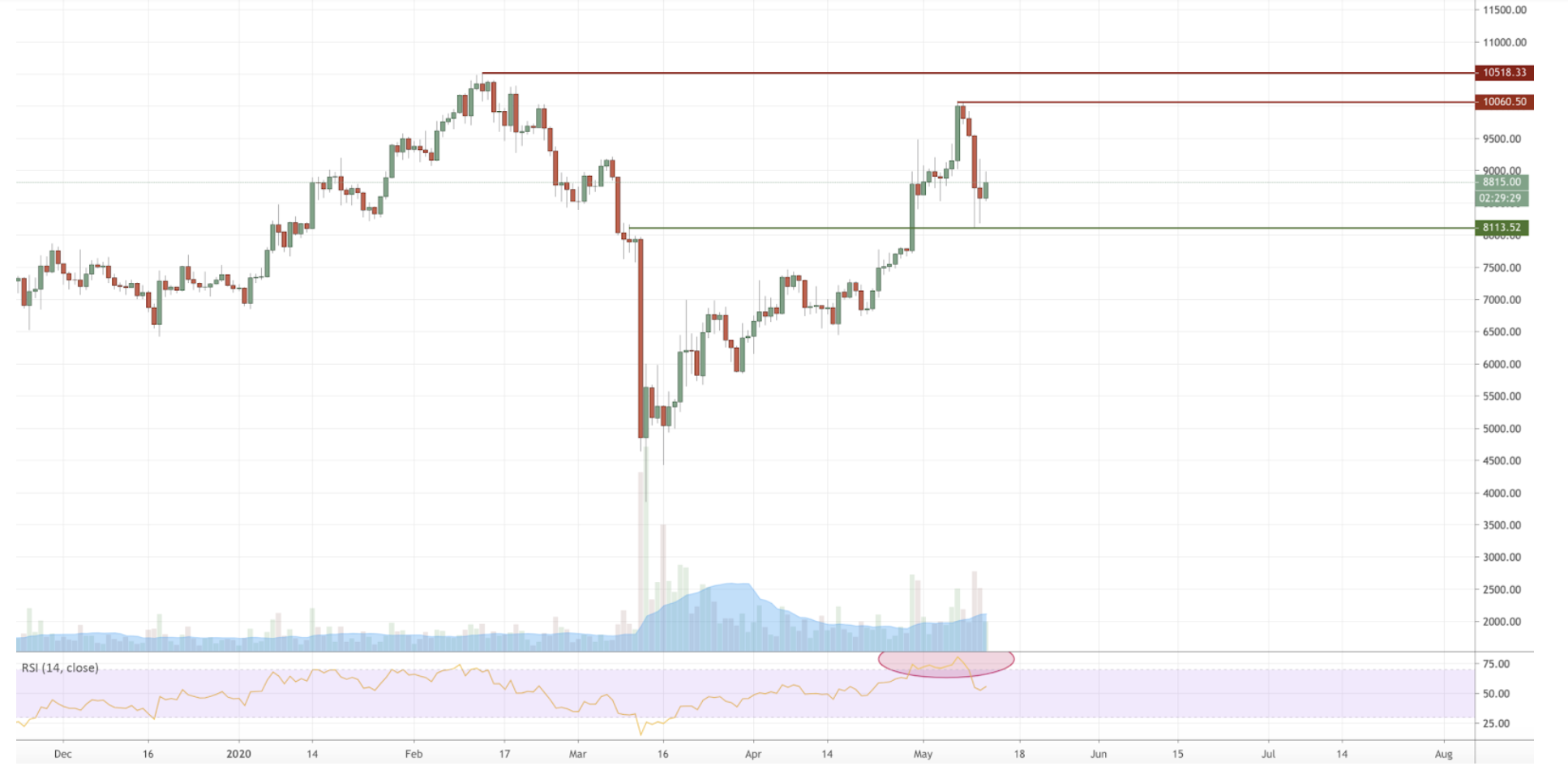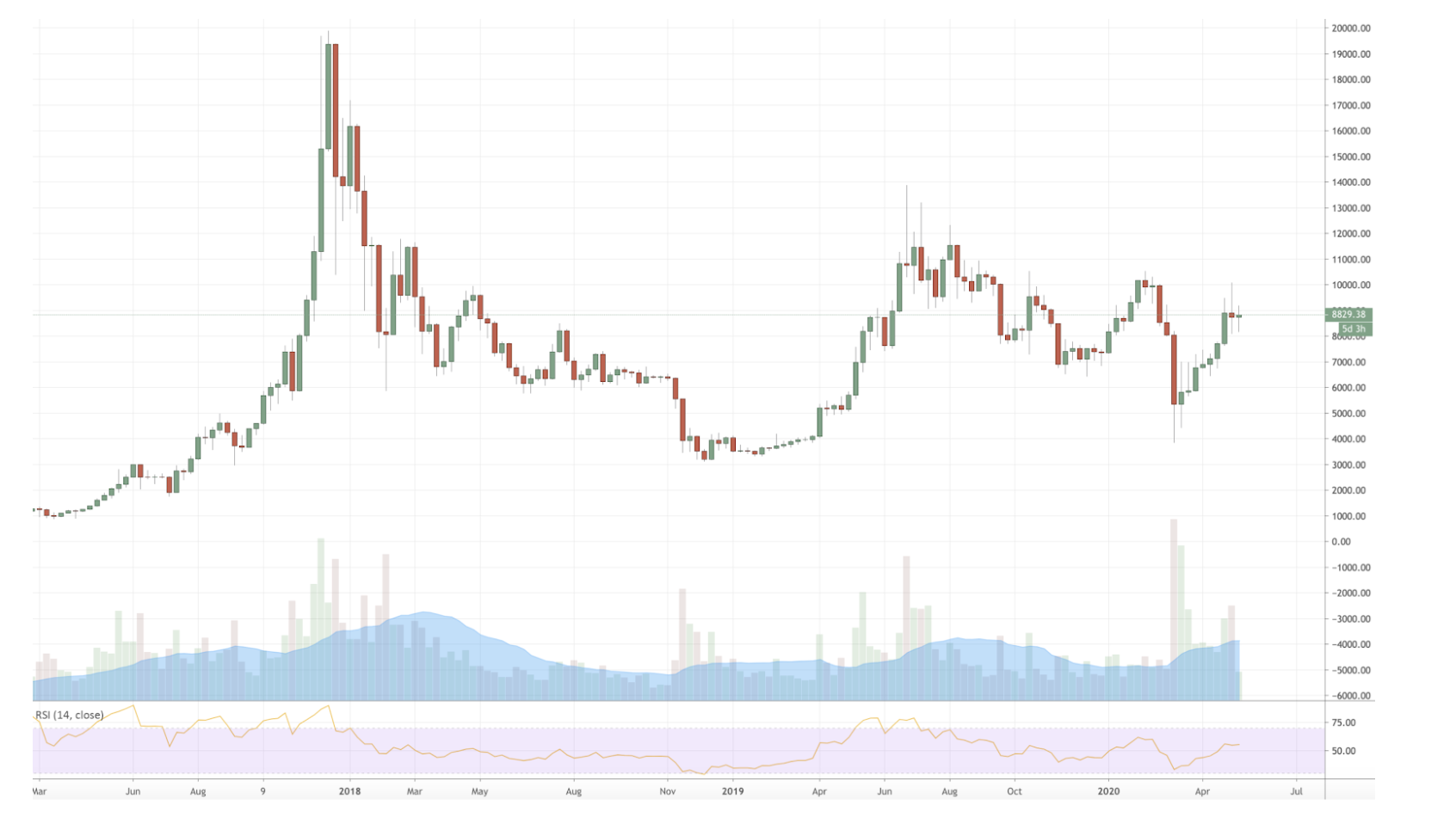 The 7th of May saw the price of Bitcoin increase $1,000 before hitting resistance at the $10,000 zone. This led to a healthy retrace to – and hold at – the previously mentioned $8,000 mark. Here, BTC was met with healthy support in the form of increased trading volumes, which helped to drive the price back into the $8,500 and $9,000 range.