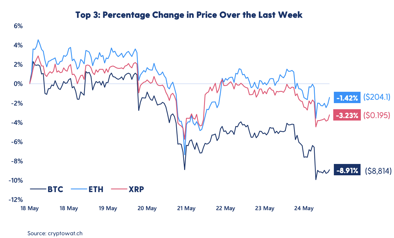 It was better news for altcoins, though. Ether and XRP both had stronger weeks than Bitcoin, albeit still having fallen slightly. The stock market too was relatively flat last week, and it will be interesting to see how crypto deals with a potential pullback as the tension between the US and China increases.