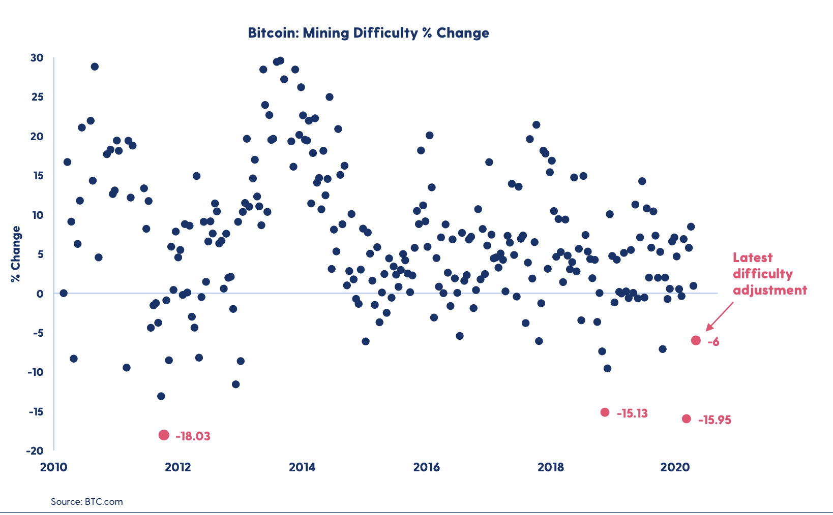 The Bitcoin network is doing well after the halving a fortnight ago. Last week, mining difficulty for Bitcoin dropped by 6%. This indicates that less miners are competing to solve the puzzle to win the freshly minted Bitcoin, as it became less profitable to mine after the halving. However, many expected a much larger drop and that this would be the end for a large group of miners. This did not happen.