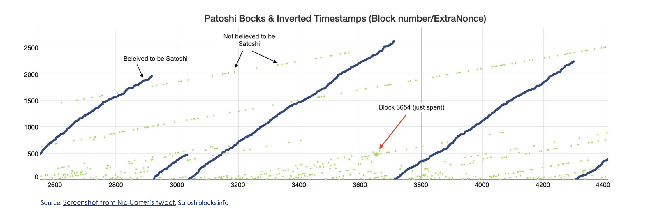 Satoshi was not the sole miner at the time of the block reward attributed to this transaction. Analysis of the Bitcoin blockchain has identified a pattern in the nonces which is linked to Satoshi. In the chart below, the blocks believed to have been mined by Satoshi (The Patoshi Blocks) are highlighted in blue. Nonces not linked to Satoshi are in green. The block contributing to the block reward that was moved this Friday does not belong in any of the Patoshi Blocks, and probably belongs to another early miner.