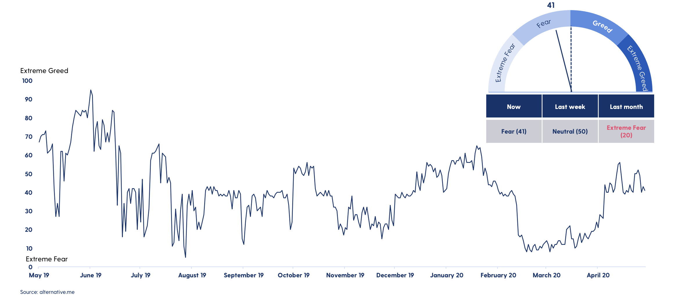 The Fear & Greed Index is now down to 41 and the market is fearful again after yet another push to a neutral state. This means that the market is more or less back to where it was a week ago, after failing to push above $10,000 for the second week in a row.