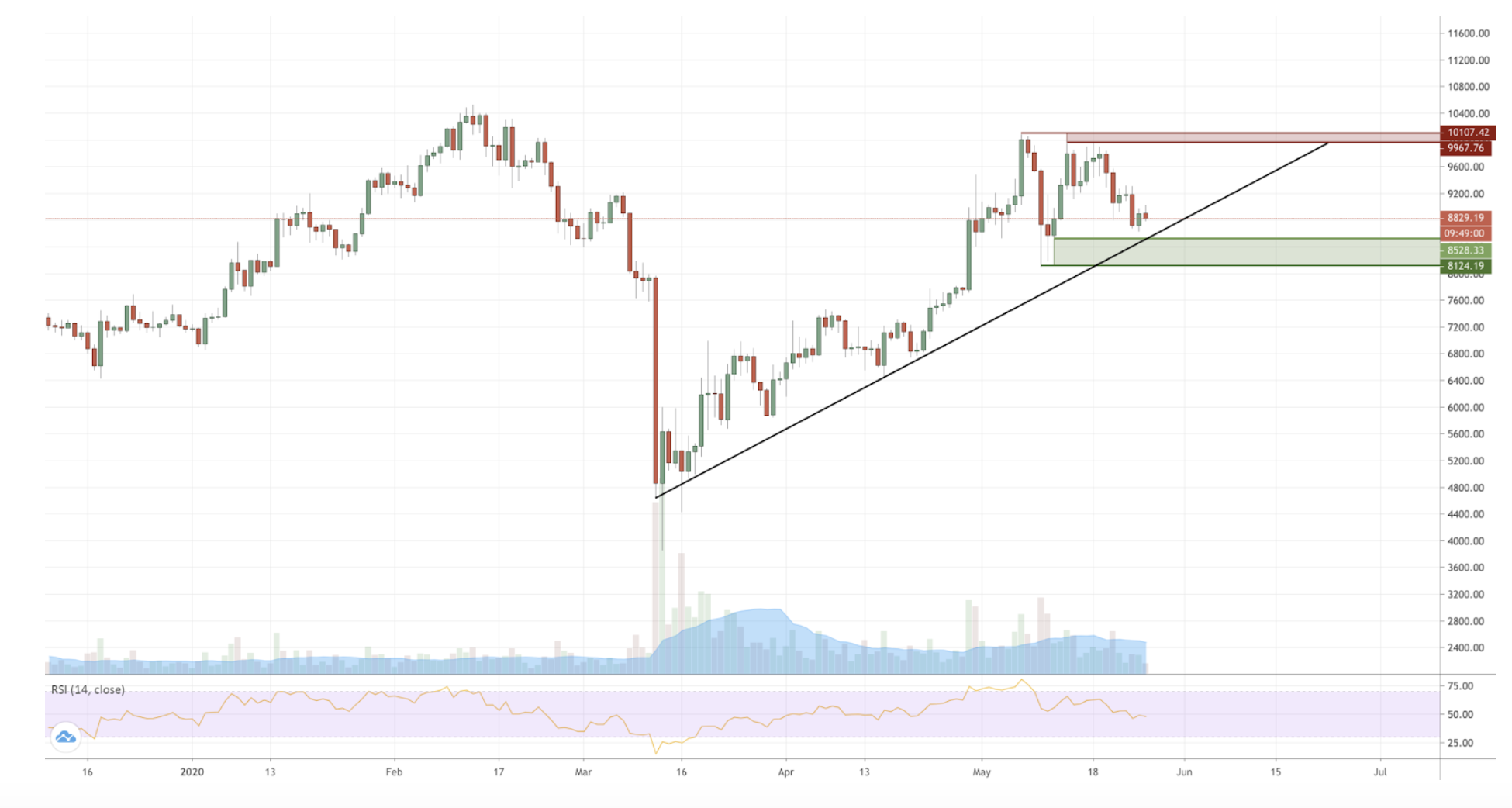 After failing to break through the $10,000 zone, Bitcoin saw its upward momentum come to an abrupt halt last week. This sparked a week-long retrace, eventually finding support at the $8,500 zone formed on 11 May. Currently trading range bound between the levels of $8,600 and $9,000, Bitcoin is in a fairly uncertain zone, with a breakout in either direction equally plausible at this point.