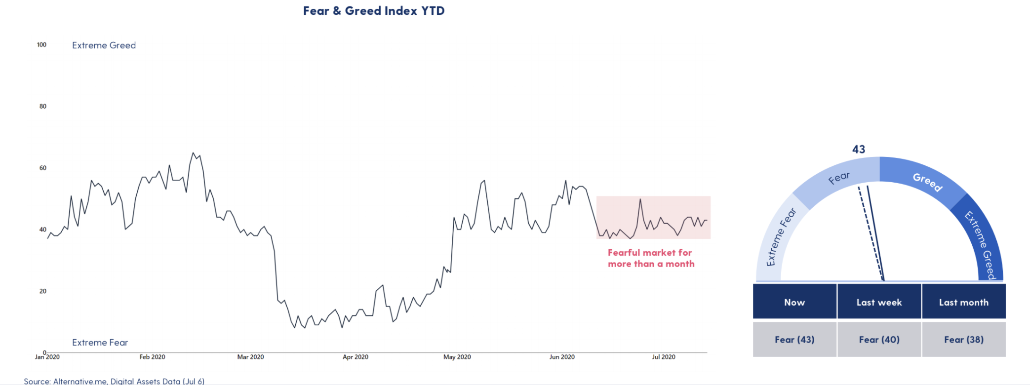 Market sentiment has not moved much over the past week, ranging below the neutral state. We would need more price action and increased trading volume to push the sentiment up in a more positive area. With the sideways price action and low volume lately, the sentiment is staying in the same area, as investors cannot decide what to think of the market right now.