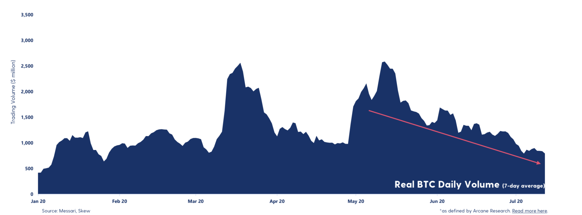 The 7-day average real trading volume continues to trend downwards this week, which is a natural result of a sideways-moving market. While the overall trading volume in the crypto market is looking more stable than the Bitcoin volume, it is certainly concerning to see this steady downwards trend for the market leader.