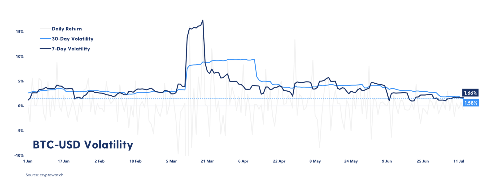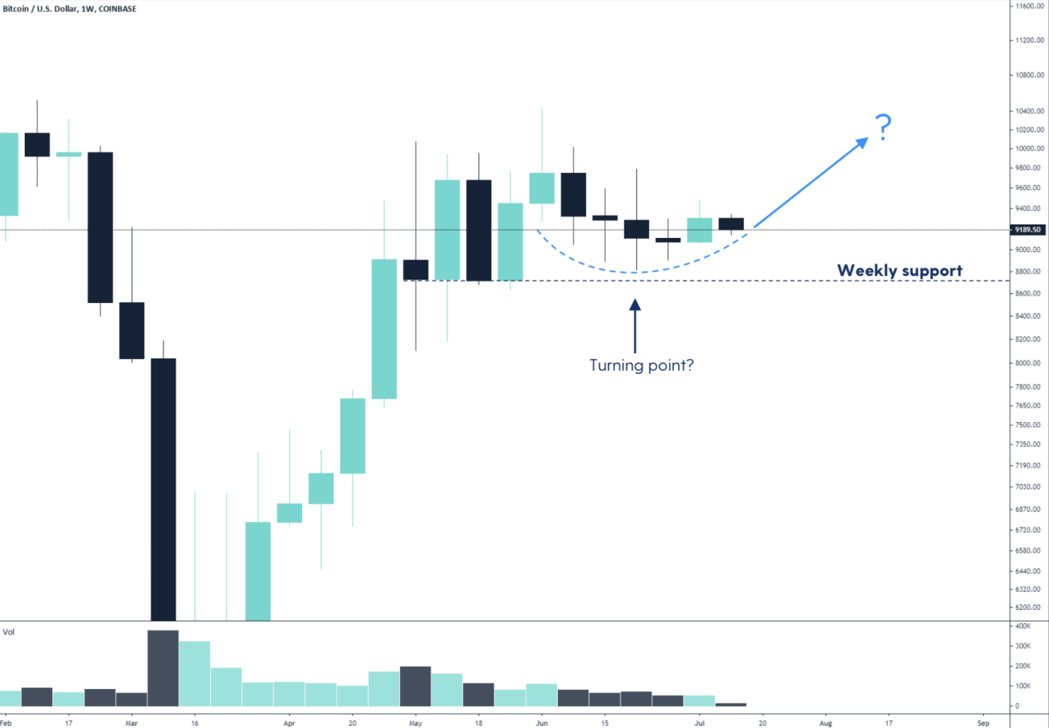 While BTC has been moving sideways for several weeks, the weekly candles could indicate a possible upcoming bullish trend. Last week closed higher than the previous two weeks, and we are starting to see higher lows for the weekly wicks. This is the opposite to most of June, where we saw lower lows for the weekly wicks. In addition, the weekly support has not been broken once. However, it’s also worth watching out for a retest of the weekly lows around $8,700, which could see another drop and indicate that the bears are back in control.