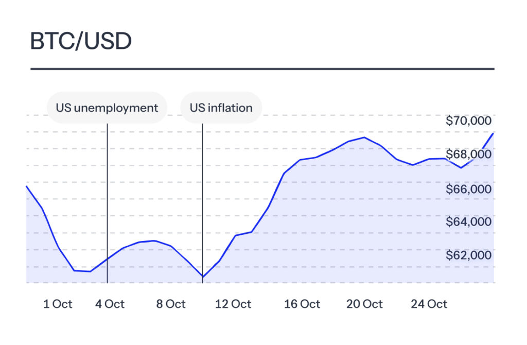 “Uptober” perhaps didn’t hit the heights we’ve come to expect from October, which has historically seen an average price increase of +22%, though it still looks set to maintain its reputation for positive performance. At time of writing, Bitcoin is changing hands for more than $67,000, a 6% increase since the beginning of the month.