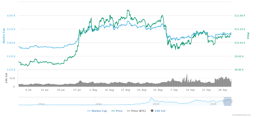 (Above: Bitcoin’s historical price data from 1 July to 1 October 2020. Source: CoinMarketCap)