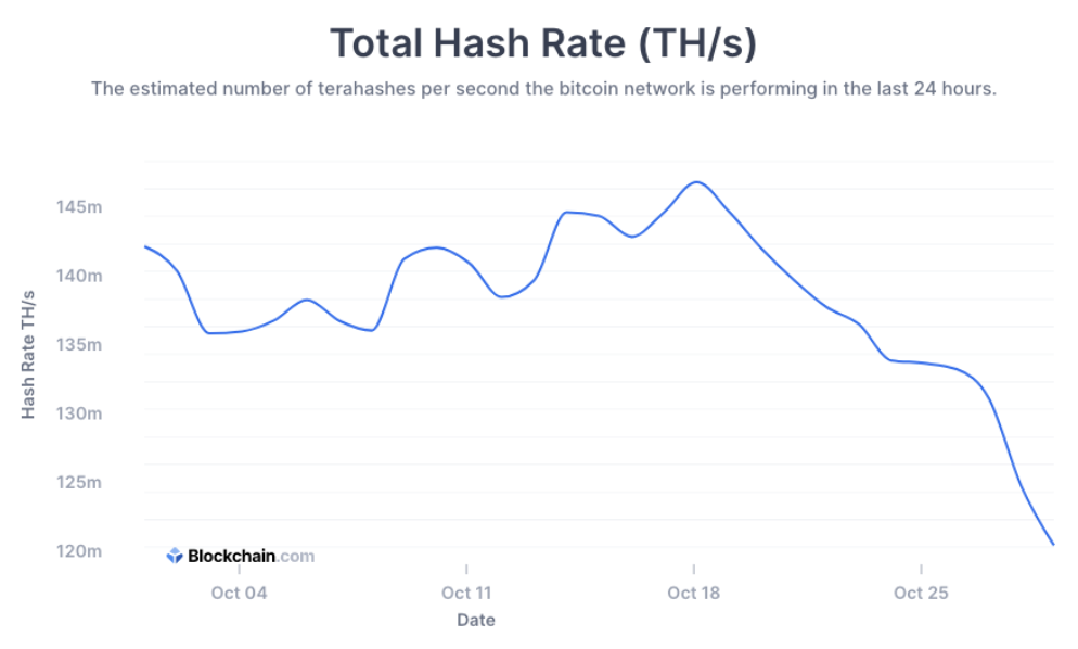 The average total computing power competing to mine bitcoin has fallen from around 142 exahashes per second (EH/s) for the first two weeks of October to 126 EH/s. During that period, bitcoin’s price rose above $13,000.