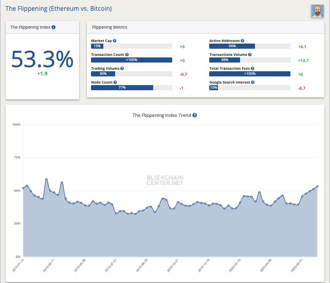The Flippening Index is designed to be a more thorough comparison, weighting the average of eight other indicators in the hopes of providing a better overall metric of the use of, and interest in, the two blockchain networks.