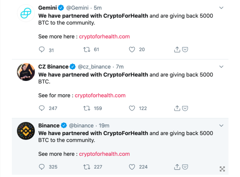 It started with crypto-centric accounts, with hackers obviously thinking exchange users were their best chance of making a fast SAT. Binance, its CEO, Changpeng “CZ” Zhao, Genesis, and Coinbase all fell victim, with many of the tweets sharing the same dubious message: “We have partnered with CryptoForHealth and are giving back 5000 BTC to the community.”