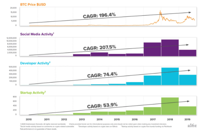 According to the report, the compound annual growth rates (CAGR) from 2010 to shows that far from being the volatile asset many claim it to be, crypto has actually shown “choppy yet consistent growth in all of [these] key metrics.”