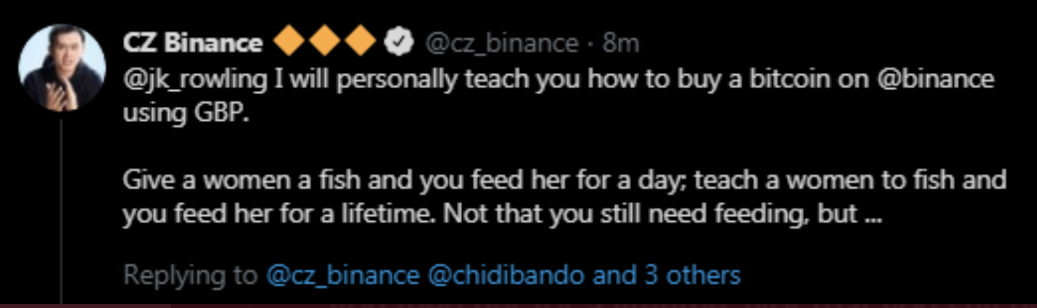 The CEO of Coinbase responded to a fake JK Rowling tweet and encouraged it to buy shitcoins pic.twitter.com/cy1zo2yCZZ