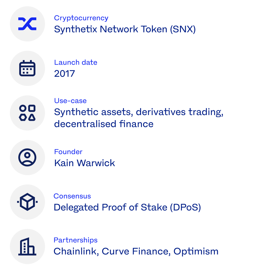 The native cryptocurrency of the Synthetix blockchain is called SNX (Synthetic Network Token). SNX serves multiple purposes within the Synthetix ecosystem. It’s used as collateral to back the value of synthetic assets (synths) created on the platform. Holders of SNX can stake their tokens as collateral and earn fees from trading activity on the platform.